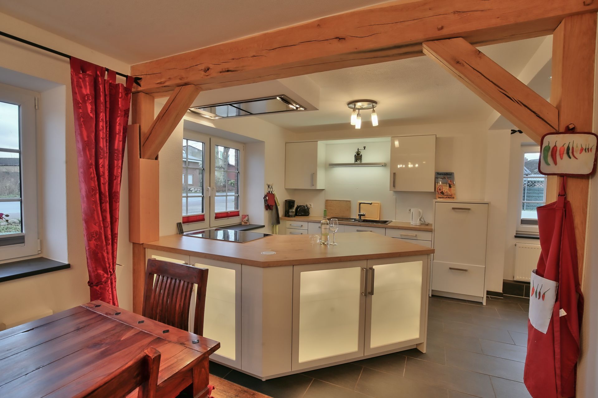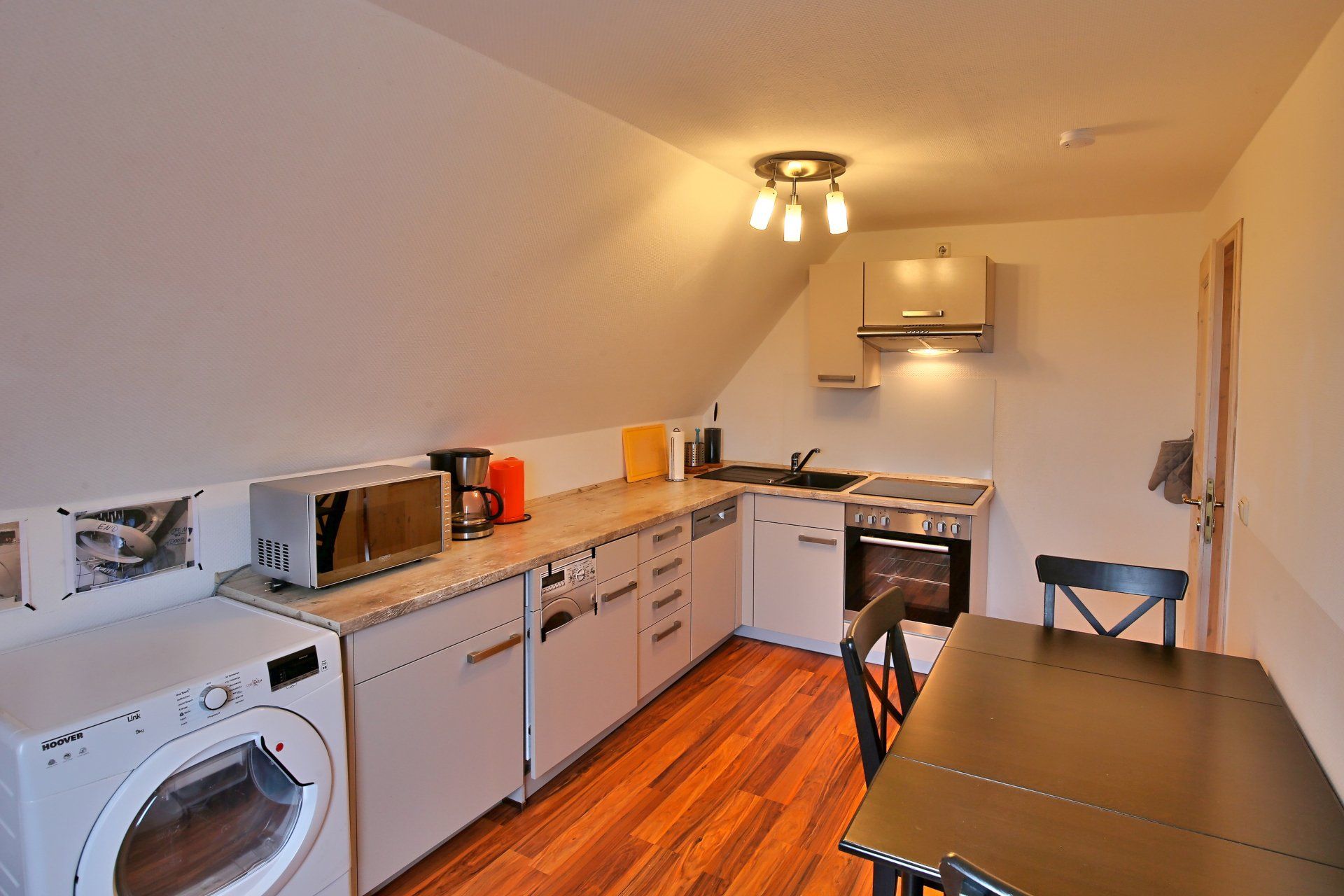 Модерна кухня със съдомиялна машина, фурна, микровълнова печка и чайник. Хладилникът и пълната баня с подово отопление са на приземния етаж.
